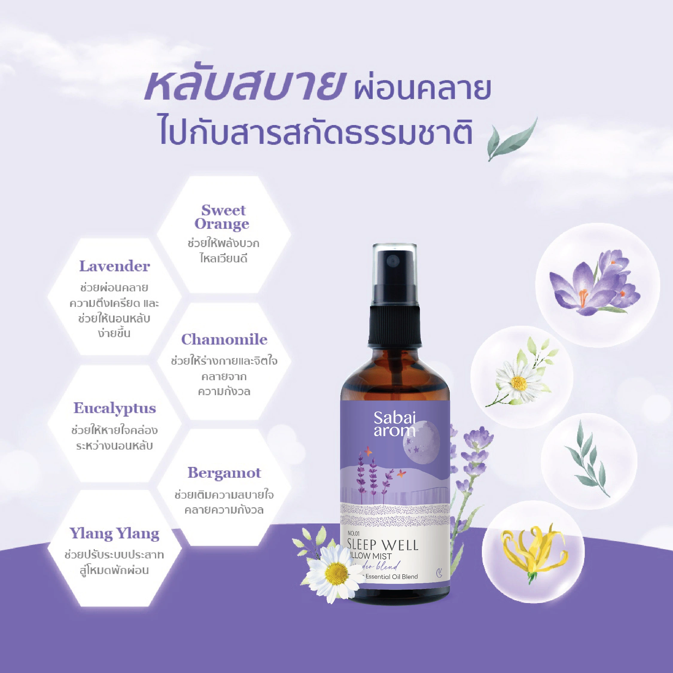 Scent : กลิ่นหอมอบอวลลึกซึ้งของดอกไม้ 3ชนิด ลาเวนเดอร์ กระดังงา และคาโมมายด์ ทำให้ประสาทคลายตัว คลายกังวล พร้อมเข้าสู่โหมดพักผ่อน หลับลึก กลิ่นเย็นสบายของยูคาลิปตัสตอนท้ายช่วยให้หายใจโล่ง หลับสบายยาวนาน